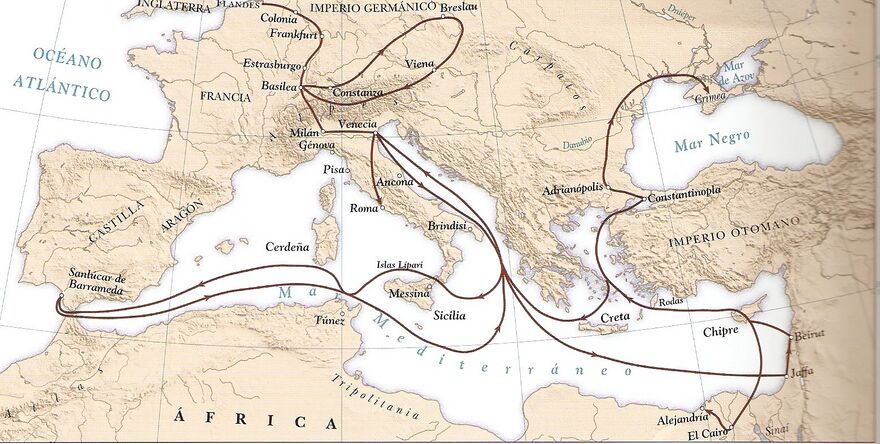 El viaje de Tafur tiene como centro neurálgico, Italia, más concretamente, Venecia, ya que siempre regresa a esta ciudad después de sus andanzas, y hace visitas al papa, con quien mantiene mantiene estrechas relaciones.[9]