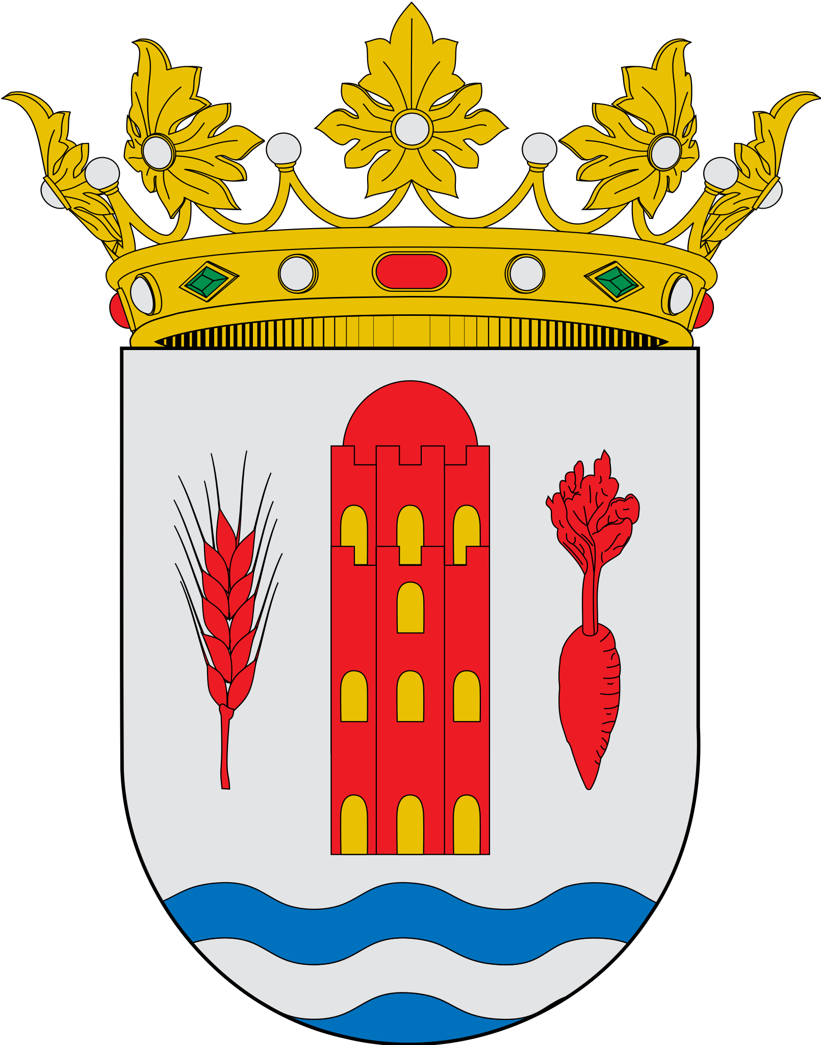 Descripción Español: Escudo de Mainar-Zaragoza. Escudo cuadrilongo de base redondeada. De plata, torre con chapitel semiesférico, de gules, aclarada de oro y acompañada a la diestra de una espiga alta y a la siniestra de un nabo, ambos de gules; en punta, tres ondas alternantes de azur y plata. Al timbre, Corona Real abierta. Source:BOA
