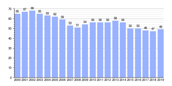 | Gráfica de evolución demográfica de Bamiro (parroquia) entre 2000 y 2019 |