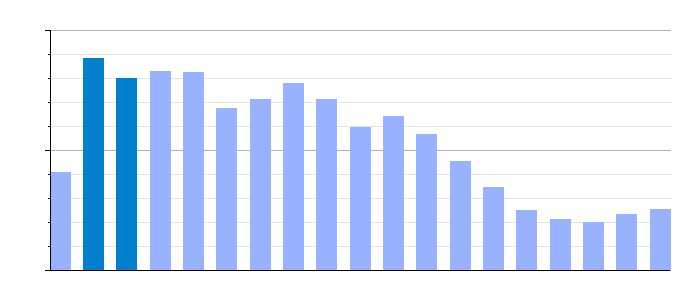 Gráfica de evolución demográfica de Chiprana[4] entre 1842 y 2021