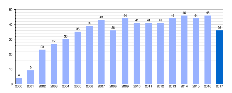 Gráfica de evolución demográfica de Dordóniz entre 2000 y 2017 |
