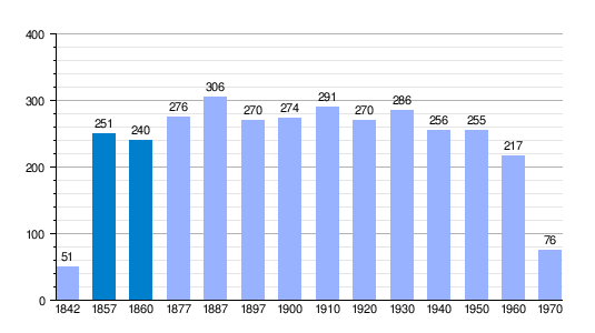 | 1842 | 1857 | 1860 | 1877 | 1887 | 1897 | 1900 | 1910 | 1920 | 1930 | 1940 | 1950 | 1960 | 1970 | 2007 | ||||||||||||||