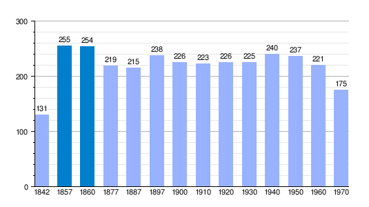 | 1842 | 1857 | 1860 | 1877 | 1887 | 1897 | 1900 | 1910 | 1920 | 1930 | 1940 | 1950 | 1960 | 1970 | |||||||||||||